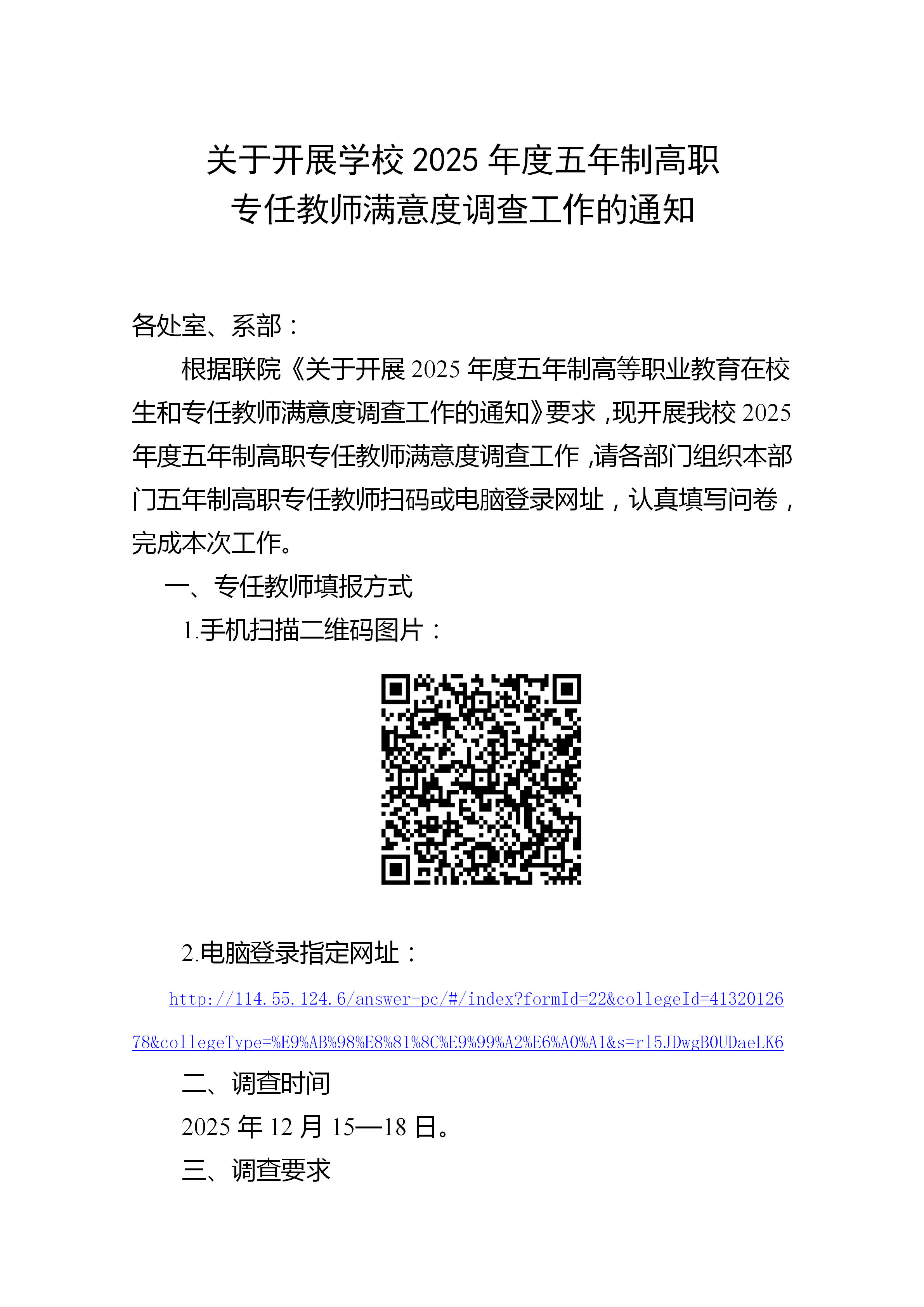 关于开展学校2025年度五年制高职专任教师满意度调查工作的通知