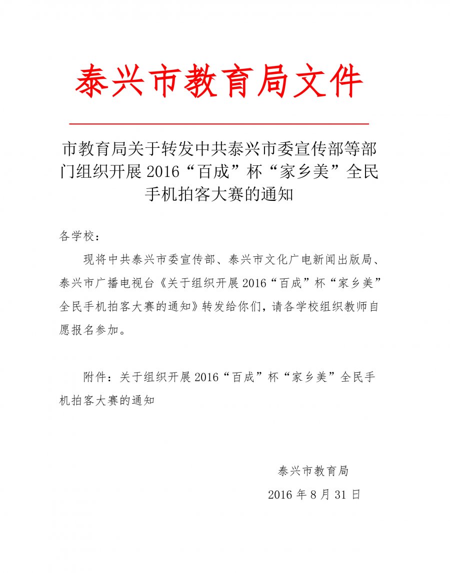 中共泰兴市委宣传部等部门组织开展2016“百成”杯“家乡美”全民手机拍客大赛的通知
