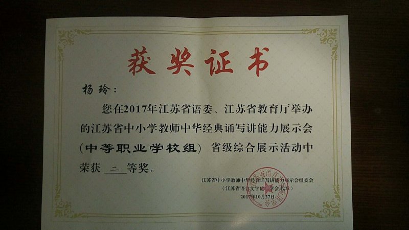 10月27日,我校杨玲老师在江苏省中小学教师中华经典诵写讲能力展示会上喜获二等奖。