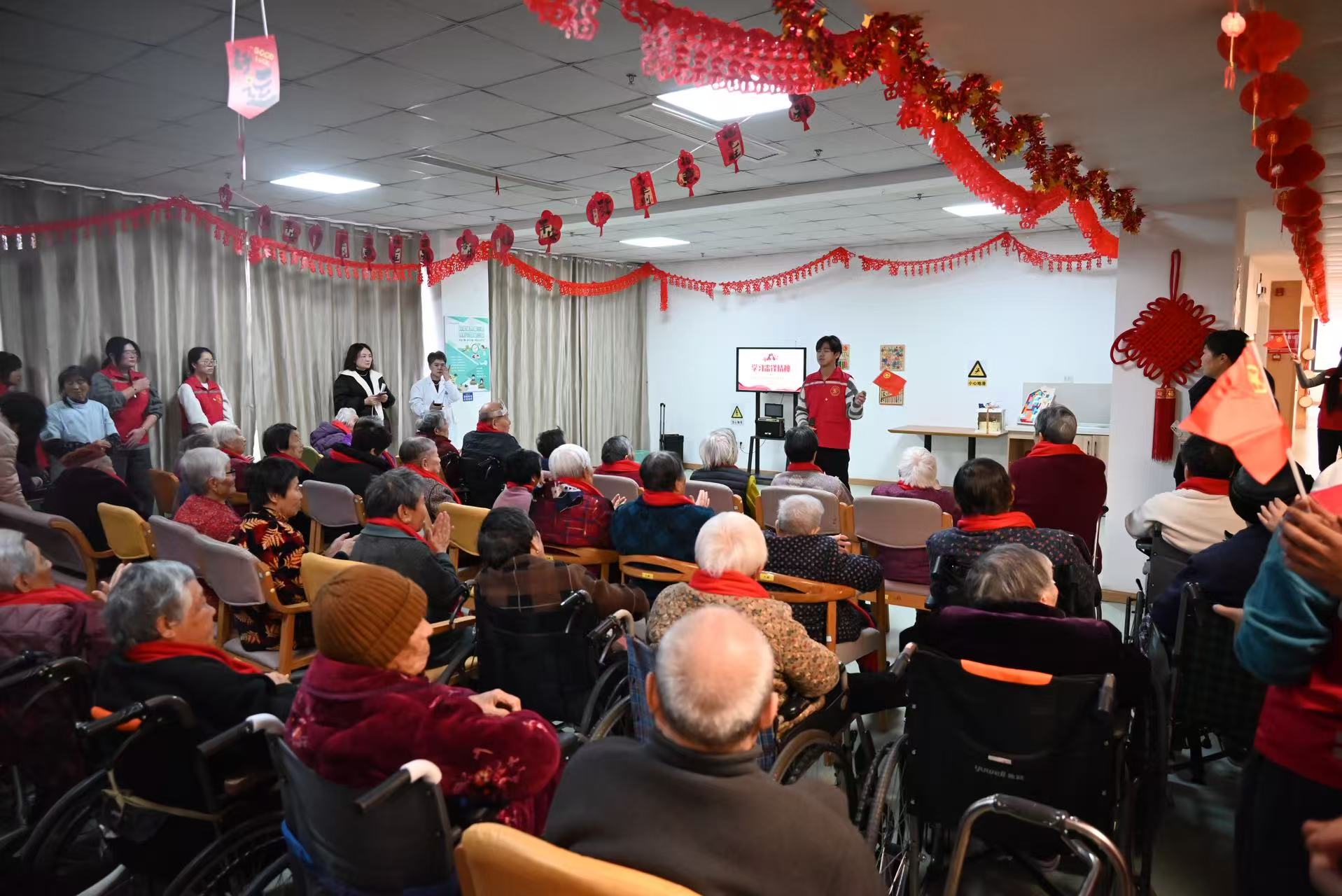 活动现场暖意融融,志愿者们献上精心编排的文艺节目。欢快灵动的舞蹈、耳熟能详的经典老歌轮番上演,旋律悠扬、气氛热烈,养老院庭院里处处洋溢着欢声笑语,老人们看得津津有味,不时报以热烈掌声。