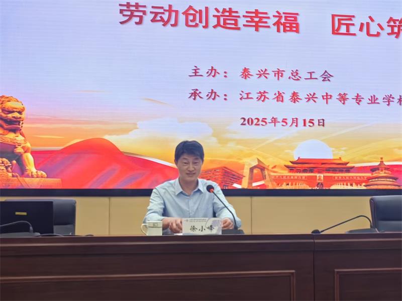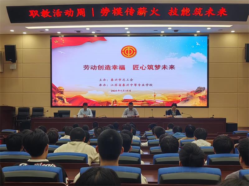 为弘扬新时代工匠精神,激励青年学子走技能成才、技能报国之路,5月15日下午,我校与泰兴市总工会联合在知行厅举办了“劳动创造幸福,匠心筑梦未来”主题宣讲。活动特邀江苏凤灵集团高级首席技师、江苏省企业首席技师、江苏工匠、江苏省“五一”劳动奖章获得者徐小峰老师担任主讲嘉宾,由学校副校长苏辉主持。