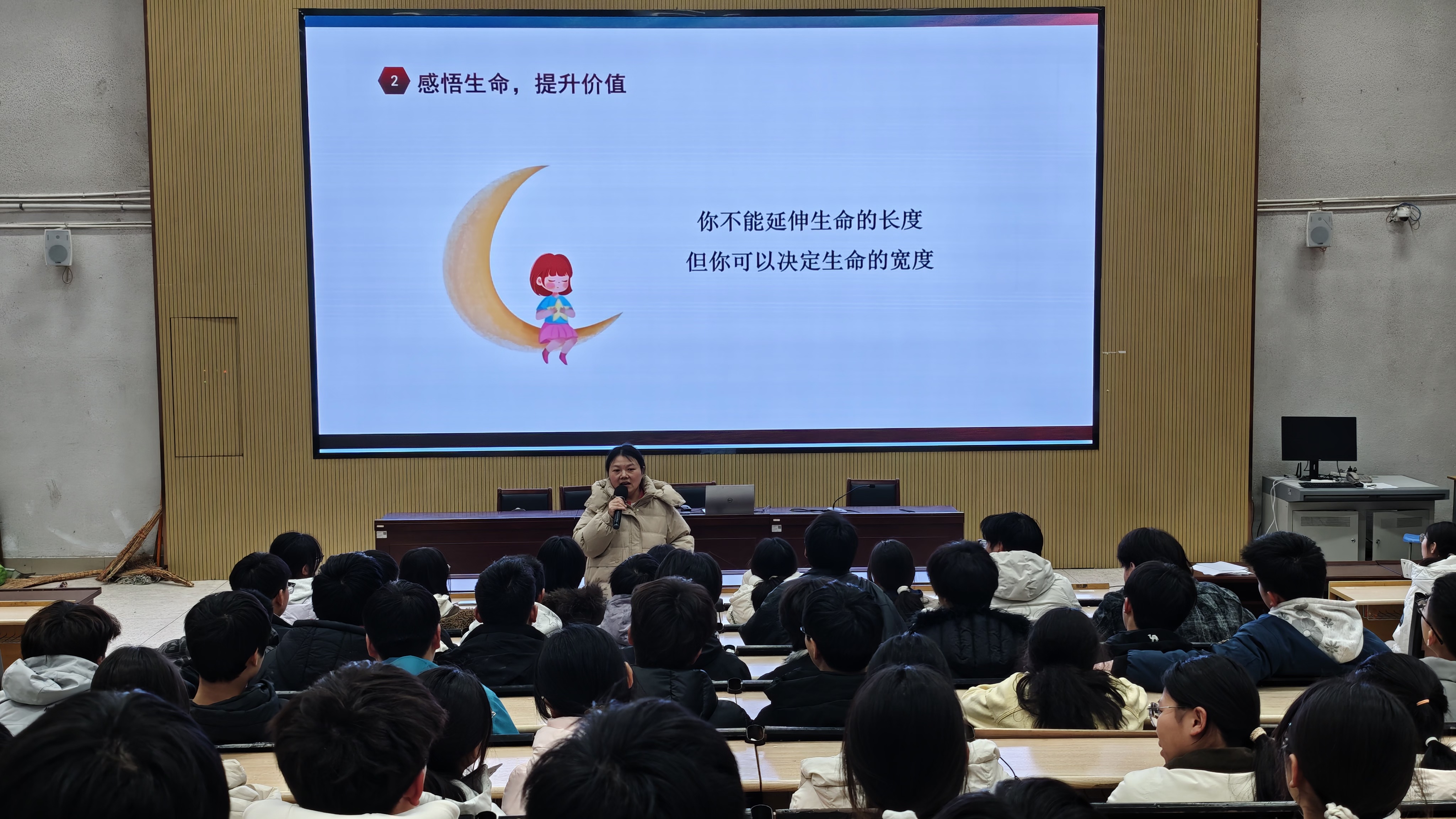 在感悟生命环节,贝多芬、海伦・凯勒、史蒂芬・霍金等榜样事迹震撼人心,黄老师鼓励大家:无法延长生命长度,却可以拓宽生命宽度,面对挫折要勇于扼住命运咽喉,以坚韧成就自我。