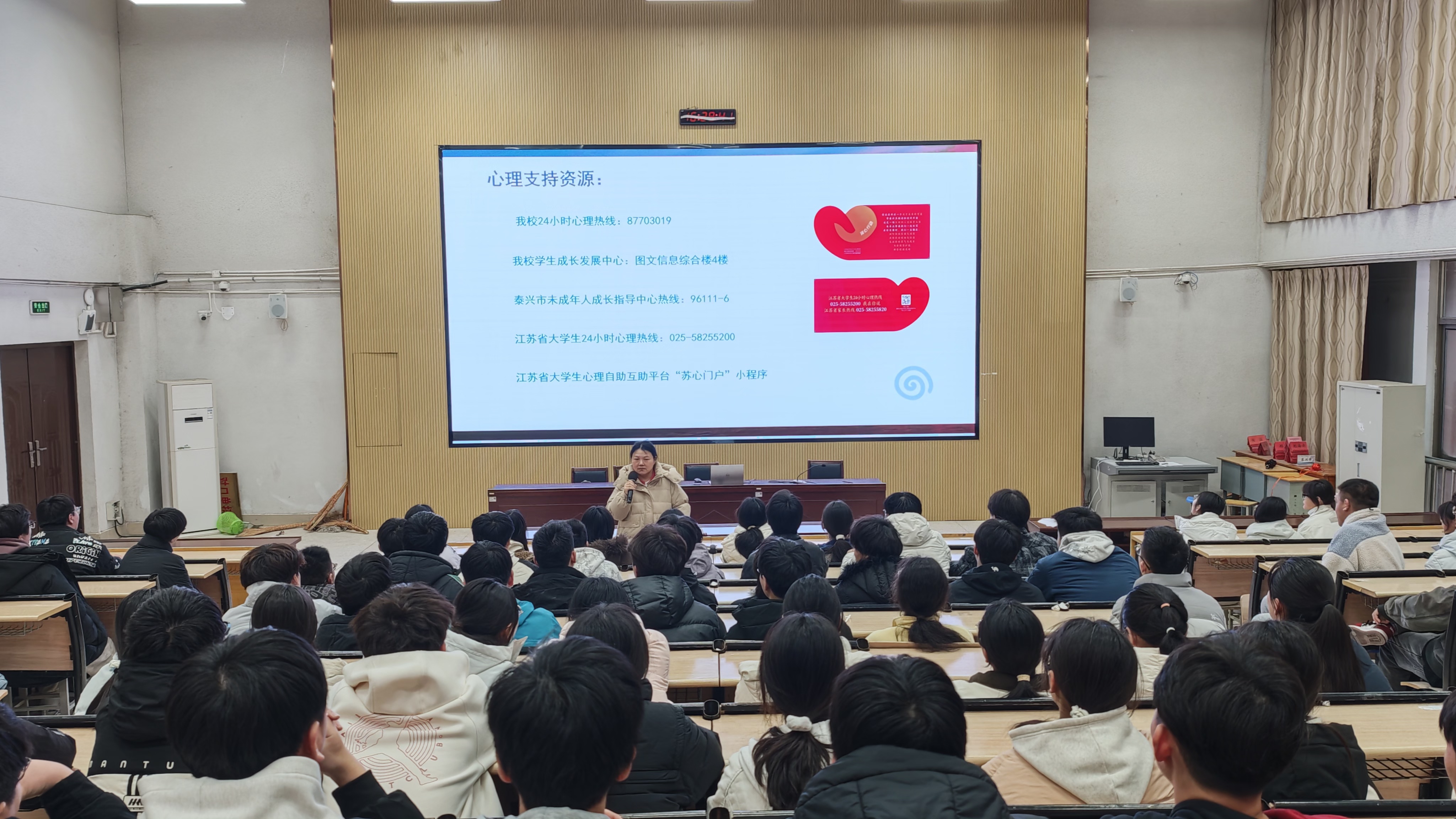 针对春季高发的情绪问题,讲座重点开展心理健康护航。黄老师详细解读 “春季抑郁症” 的成因、信号与应对方法,从作息、运动、饮食、求助等方面给出可落地的调节建议,并现场公布校园 24 小时心理热线、市级未成年人指导中心、省级心理支持平台等资源,为学生搭建坚实的心理支持网络。