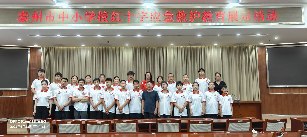 2025年6月28日,我校教师:樊琦、冷亮、林亮、王绍裘,我校学生:丁佳鑫、钱艺钧、吴蕊、黄荣华,在泰州市教育局参加泰州市中小学红十字应急救护教育展示活动,我校师生表现优异荣获泰州市团体赛一等奖!
