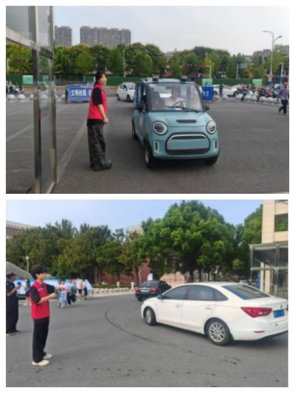 校园入口及主干道上,另一组学生会志愿者化身“交通疏导员”,全力维护车辆通行秩序。面对前来送学的车辆高峰,他们提前在指定区域引导车辆有序停放,提醒驾驶员即停即走,避免造成交通堵塞,缓解了校园门口的交通压力,保障了报到期间校园交通的安全与畅通。