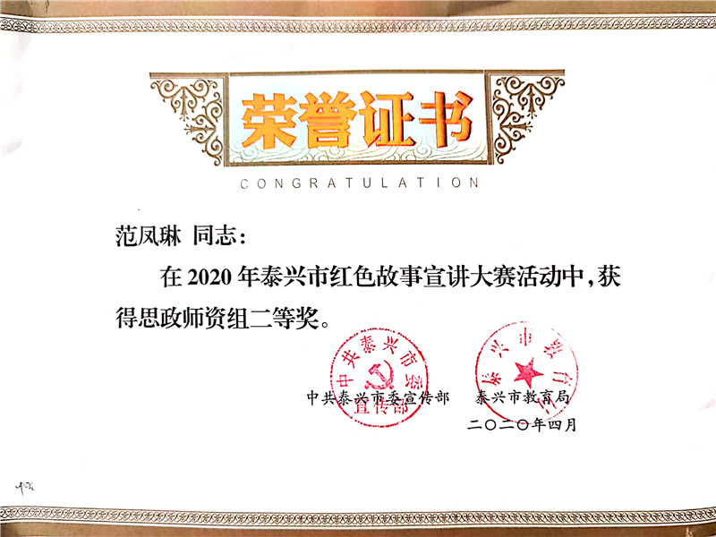 我校师生在泰兴市委宣传部、泰兴市教育局联合举办的2020年泰兴市红色故事宣讲比赛中获奖。