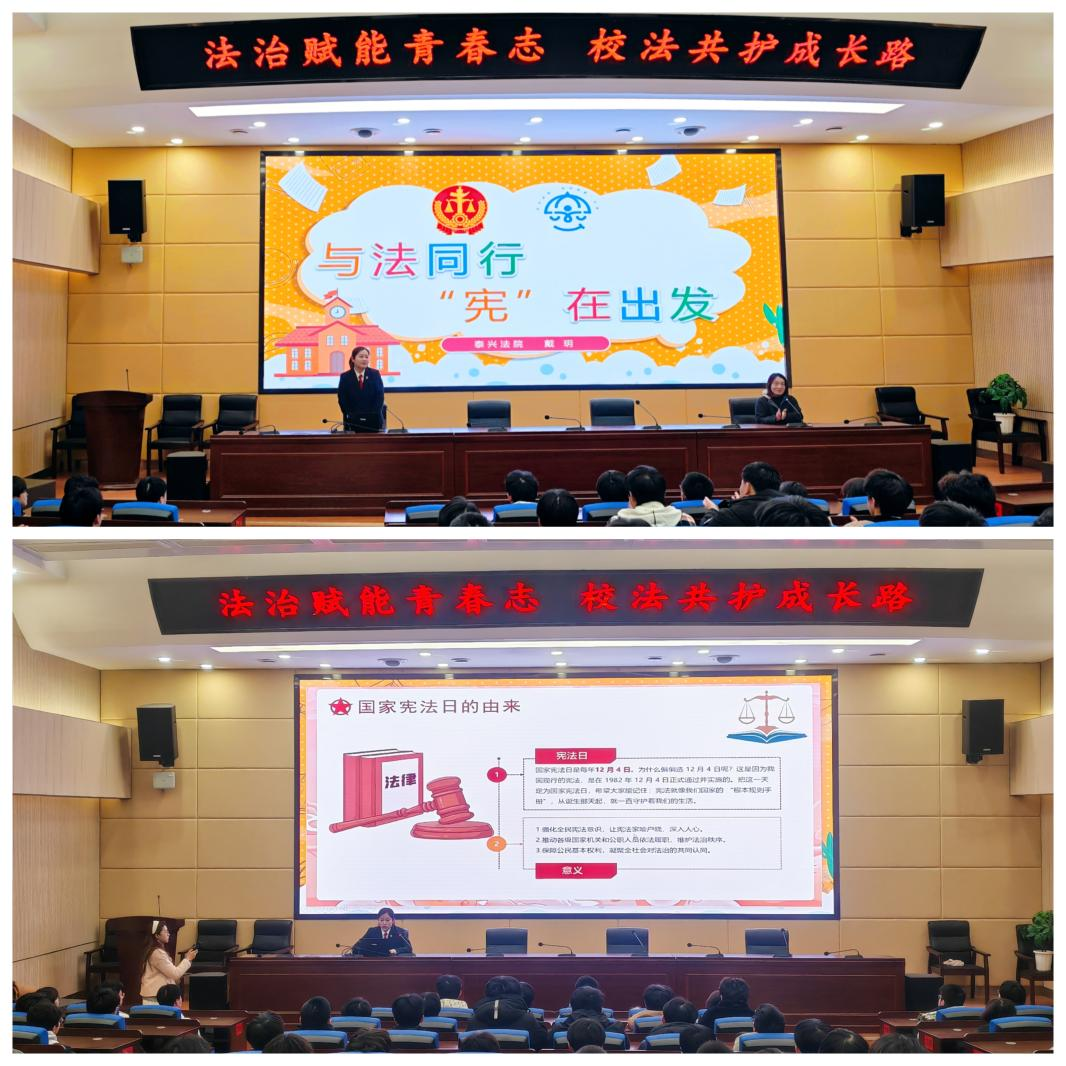 泰兴市人民法院法官助理戴玥受邀走进我校,以“与法同行,宪在出发”为主题开展法治教育讲座。