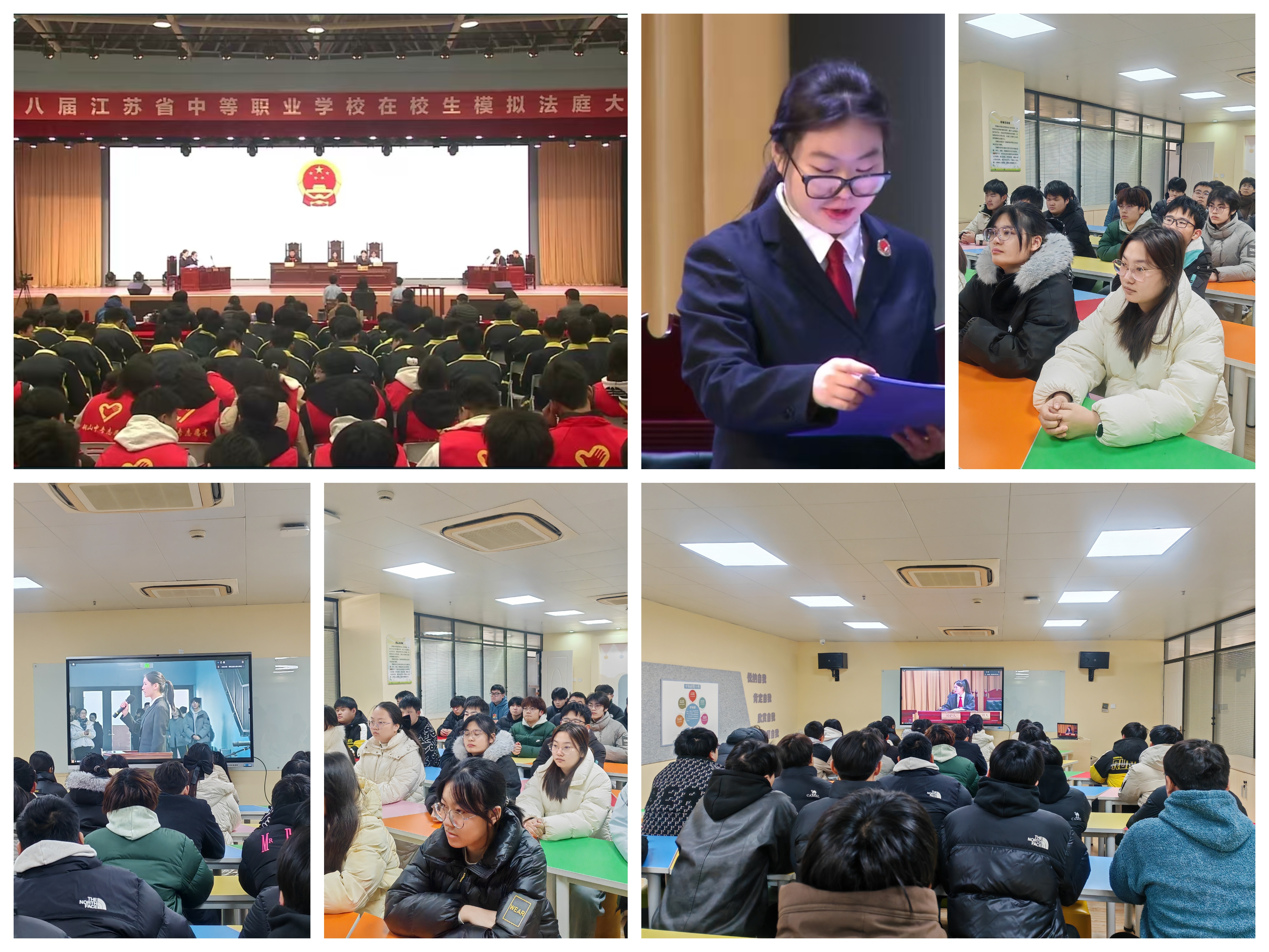 我校组织学生集中观看第八届江苏省中等专业学校在校生模拟法庭决赛直播。直播中,参赛选手们严谨的逻辑推理、专业的法律表述、逼真的庭审演绎,让同学们直观感受到了法律的威严与庭审的庄重。我校选派的参赛队伍在此次比赛中成功荣获省三等奖。