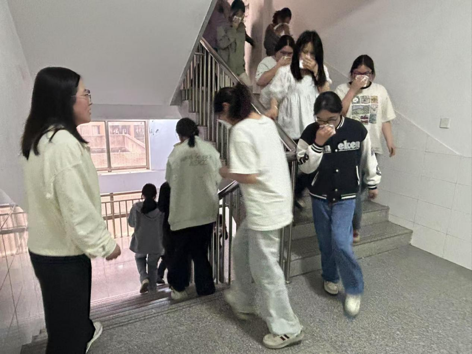 正式演习开始后,全体演习参与者立刻进入状态,以井然有序、行动迅捷之势快速疏散,全体人员弯腰低姿、用湿毛巾捂住口鼻,沿东西两侧楼梯有序撤离。整个过程参演师生仅用8分钟便完成从宿舍楼到西侧安全集结区的疏散。随后各宿舍舍长现场清点人数,班主任向总指挥汇报人数情况,确认无人员滞留。最后,朱岳主任进行总结讲话,肯定演练“反应迅速、秩序井然”,并强调“安全无小事,应急技能需常练常新”。