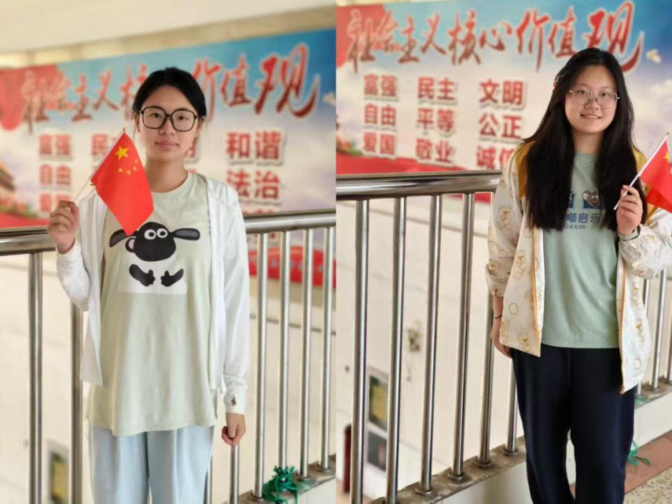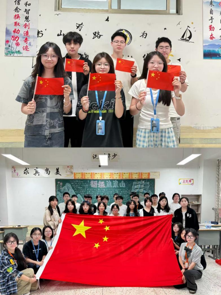 教学楼里,同学们以黑板、课桌为背景,手执鲜艳的五星红旗,绽放出青春的笑容。同学们说:“教室是我们学习成长的地方,在这里与国旗合影,更让我们意识到青年一代的责任与担当。”
