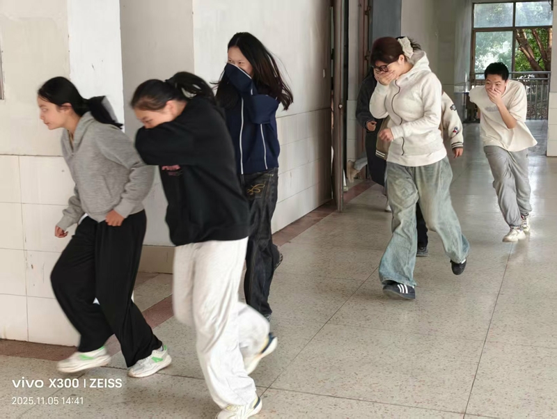 下午14时40分,随着消防警报声在校园内响起,消防演练正式拉开帷幕。管理工程系的同学们在现场工作人员的引导下,迅速做出反应,用衣物、手帕等捂住口鼻,身体尽量贴近地面,沿着预定的疏散路线快速、有序地从教学楼撤离。整个疏散过程紧张而不慌乱,充分展现了师生们良好的应急素养。