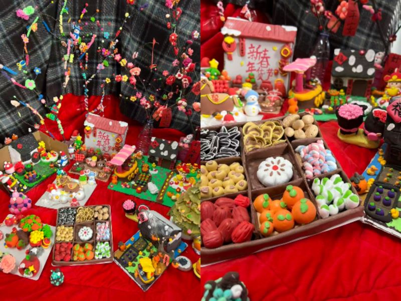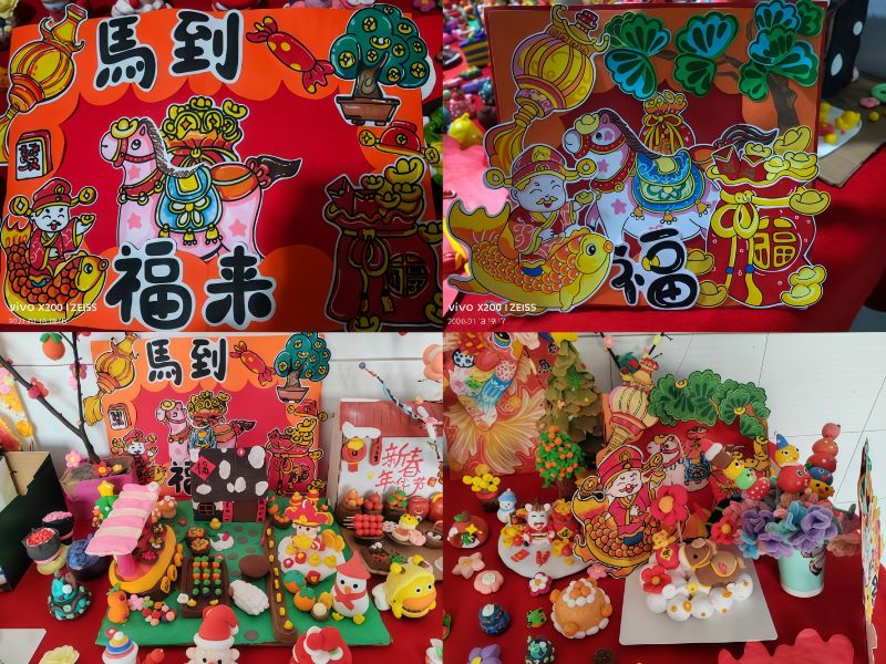 活动现场,同学们以指尖巧思揉捻彩泥,将灯笼、福字、年货市集等新春元素化为生动立体的手工作品,让年味在创意中“活”了起来。同学们将超轻粘土塑造成一个个鲜活的新年意象:有的同学搭建起微型“福气小院”,有的同学还原了新春市集的热闹场景,还有的同学创作了美食宴。同学们用揉、捏、搓、贴的手法,把对新年的期待揉进每一块粘土里。同学们还用红纸剪裁各式各样的年画,表达对马年的期盼与美好祝愿。