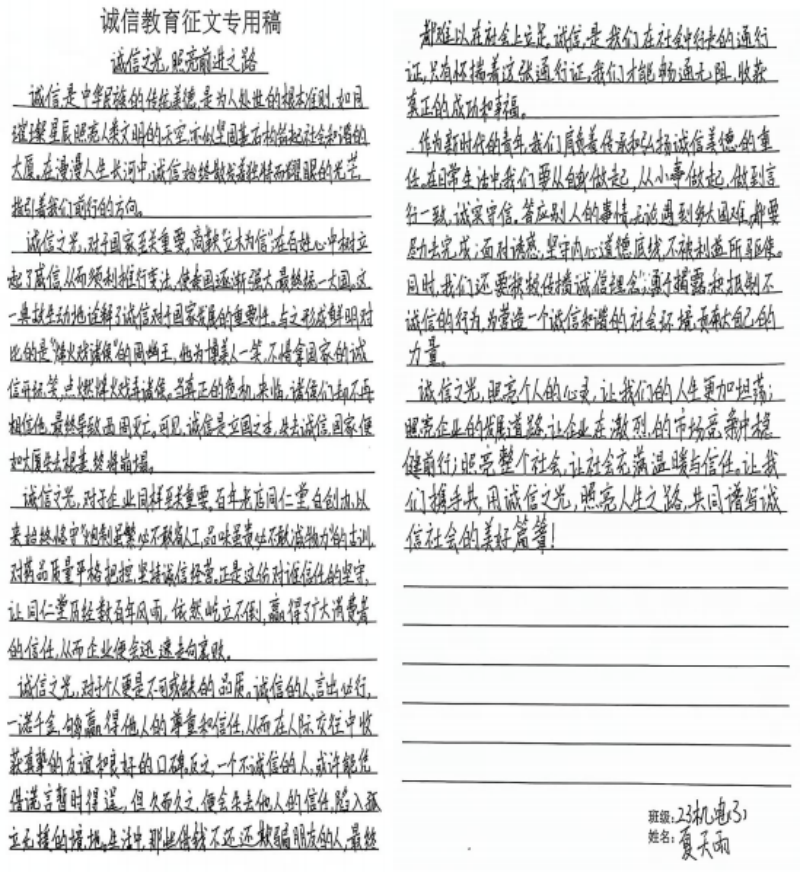为深入贯彻落实习近平新时代中国特色社会主义思想,弘扬社会主义核心价 值观,加强校园诚信文化建设,培养学生的诚信意识和道德素养,引导学生树立 正确的价值观和人生观,营造诚实守信的校园氛围,机电工程系 5 月 26 日举办 “诚信为本,筑梦未来 ”诚信教育主题征文比赛。