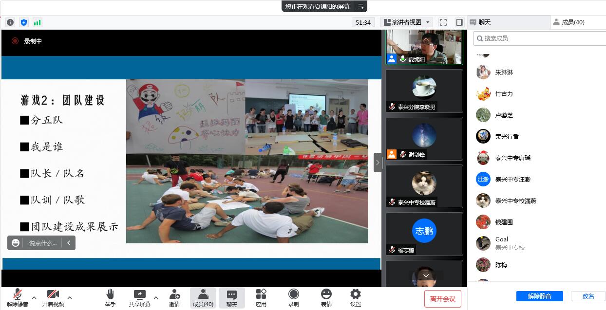 夏锦阳教授从泰兴中专校体育教学实际情况、教师教学困惑、学生发展方向等方面精心入手,分析了高中体育核心素养的内涵及意义,由此引入体育拓展的概念,并对体育拓展的历史发展、作用意义作了深刻剖析,最后,通过30个体育拓展教学项目,进行了详尽讲解,深刻分析了素质游戏拓展与体育活动组织策划的实施方式。夏锦阳教授讲授由浅入深,循序渐进,由表及里,由认知到内涵,从理论到实践,引导教师们认识拓展训练的魅力,启迪了老师们教科研和教学实践的新方向,也为课堂教学的创新提供了参照。
