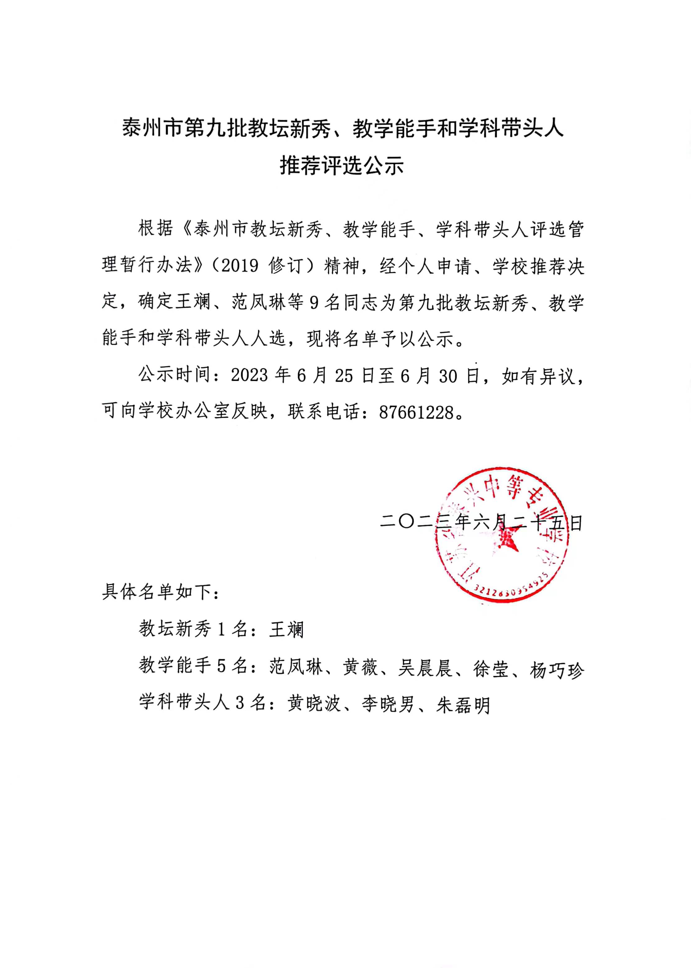 - 泰州市第九批教坛新秀、教学能手和学科带头人推荐评选公示2023-06-25