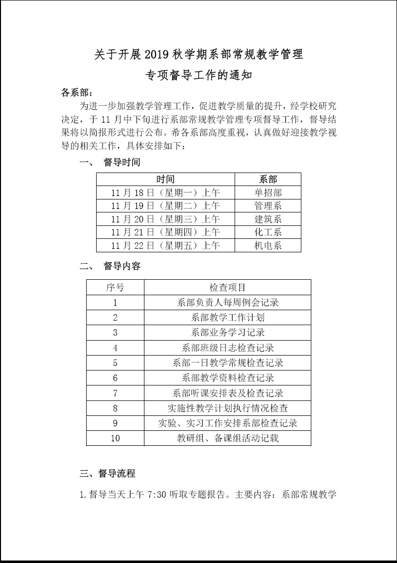 关于开展2019秋学期系部常规教学管理专项督导工作的通知
