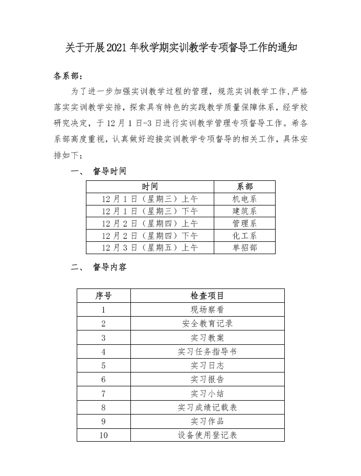 关于开展2021年秋学期实训教学专项督导工作的通知