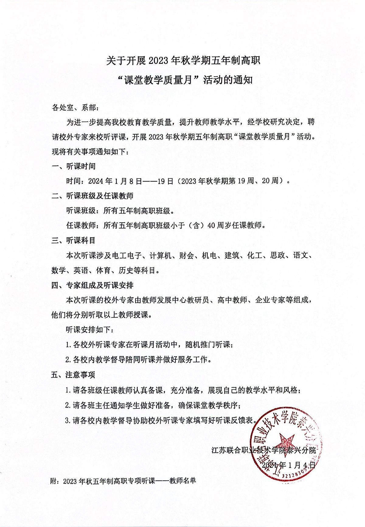 关于开展2023年秋学期五年制高职课堂教学质量月活动的通知