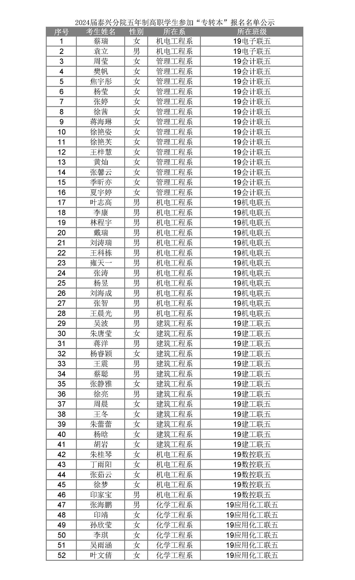 根据江苏联合职业技术学院关于做好2024年五年一贯制高职(高师)“专转本”报名组织工作的通知(苏联院〔2024〕1号)要求,严格依据报考条件、学籍管理有关规定,泰兴分院、省联院、报考院校对考生逐层进行资格审核,现将审核合格的学生名单予以公示。公示期:2024年1月26日—1月31日。如有异议,请在1月31日前向学校党政办公室反映,电话:0523-87661228。