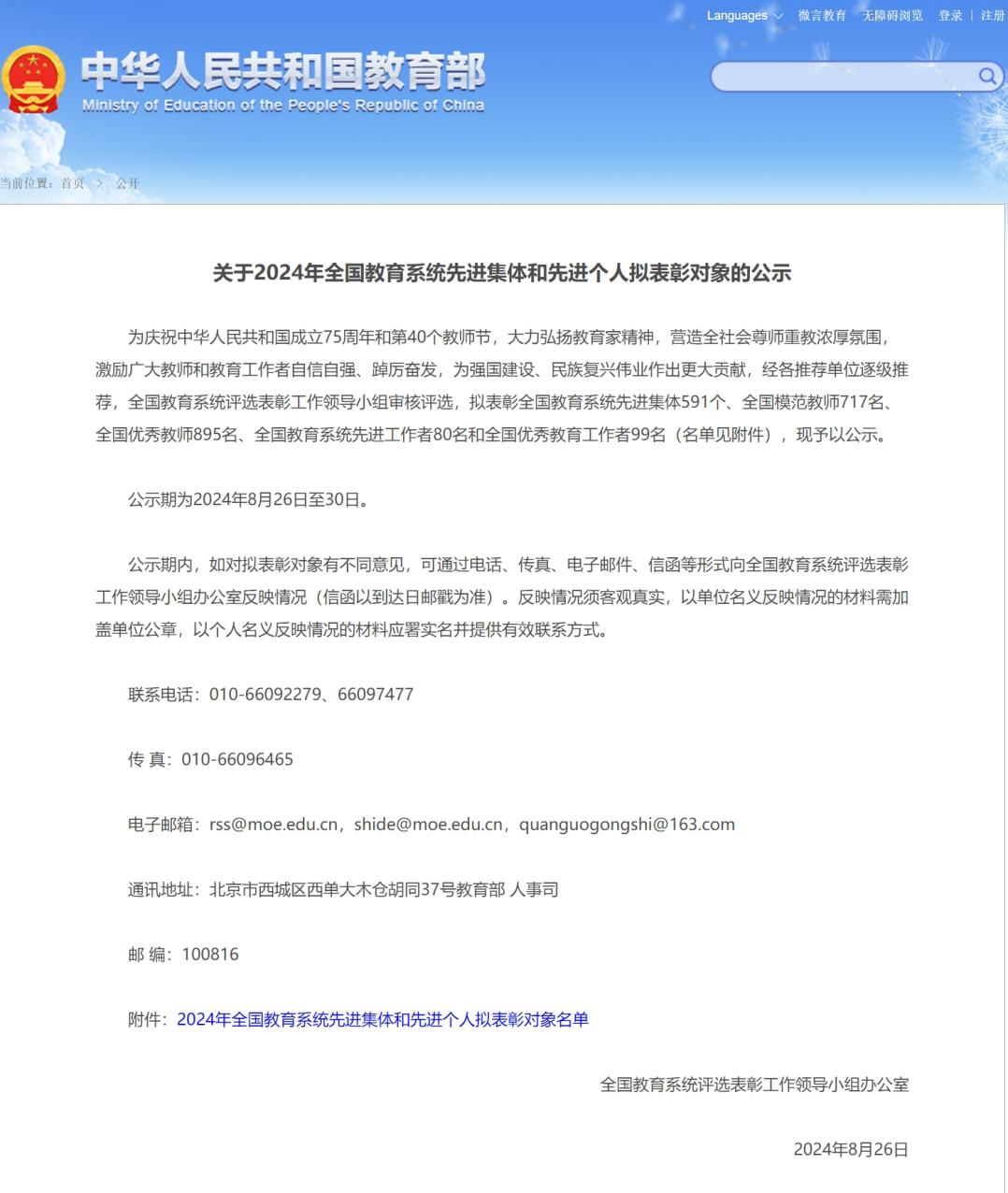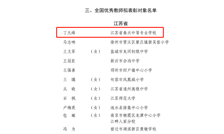 为庆祝中华人民共和国成立75周年和第40个教师节,大力弘扬教育家精神,营造全社会尊师重教浓厚氛围,激励广大教师和教育工作者自信自强、踔厉奋发,为强国建设、民族复兴伟业作出更大贡献,教育部开展了2024年全国教育系统先进集体和先进个人评选活动,近日公布了评选结果,我校教师丁九峰荣获“全国优秀教师”荣誉称号。