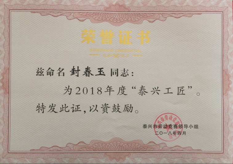 五一期间,我校封春玉老师被泰兴市劳动竞赛领导小组授予“泰兴工匠”称号。