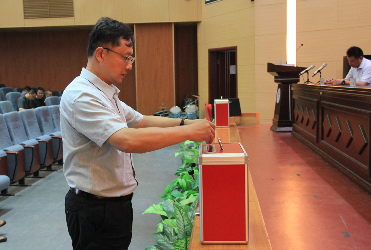 民主测评环节,教师们慎重考量后填写测评表并有序投入投票箱。
