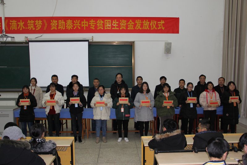 12月20日下午,我校隆重举行省扶贫“三会”“滴水•筑梦”和 新浦爱心助学金发放仪式。市团委副书记刘雨婷、学少部部长刘一超,新浦化学(泰兴)有限公司代表张毓育、鲁景娟及学校领导班子、全体受助学生参加发放仪式。 发放仪式上,刘正生副校长向受助学生提出了殷切希望,希望受助学生要把滴水之恩,化为立志成才、报效祖国、回报社会的强大动力,化为克服困难、知难而进的勇气,不畏贫穷、自强不息,勤奋学习、积极向上,用优异的的成绩,努力增强为党、为国家、为人民服务的本领,为祖国、为家乡奉献青春、智慧和力量。 17机电(1)班的周圣丹同学作为学生代表发言,她介绍了受助一年来自己在学习和思想方面的进步,并表示要带一颗感恩的心将爱心传递下去,让温暖传遍人间,尽力去帮忙困难的人们。并代表全体受助学生向所有关心贫困生成长的各界人士表达了最诚挚的谢意。 最后,参加仪式的领导把助学扶贫资金亲自交到每位受助学生的手上,微笑的面容、慈祥的目光、鼓励的话语、温暖的双手,融化了150名受助学生的心