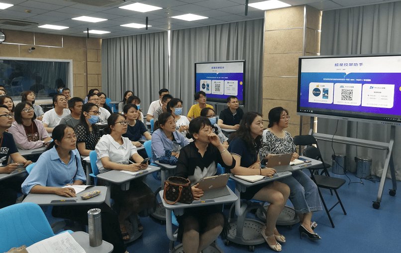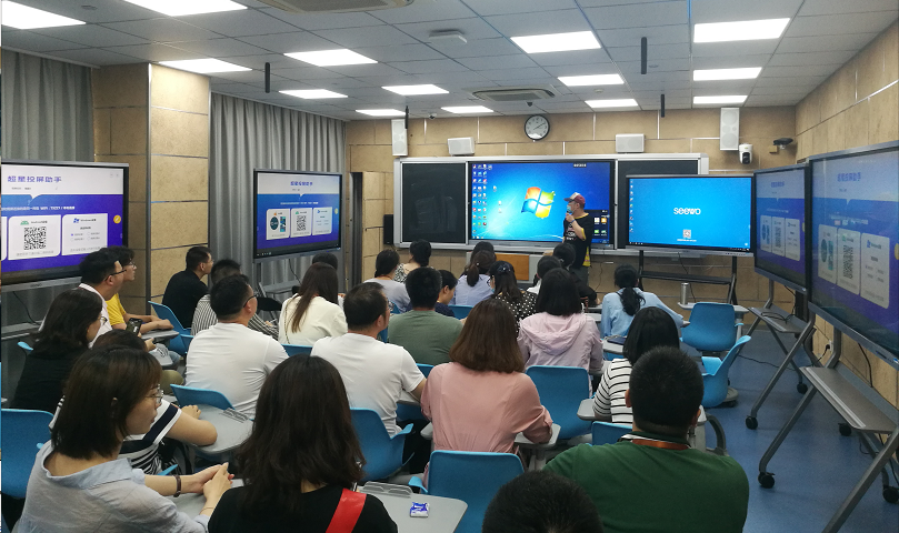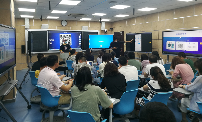 培训分为两部分内容,首先对于智慧教室六块大屏的相互联动进行培训,老师和学生在课堂上通过无线局域网流畅的进行教师屏幕共享、师生多屏互动、小组讨论多屏互动等。其次对于网络教学平台及学习通在信息化教学过程中的使用再次进行了细致的培训和答疑。