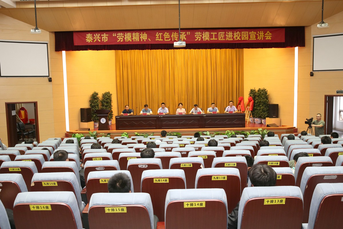 6月18日下午,我校企业大师工作室揭牌仪式暨泰兴市“劳模精神,红色传承”劳模工匠进校园宣讲会在报告厅举行。泰兴市总工会副主席赵建华,我校副校长曹荣军,全国劳模、全国五一劳动奖章获得者凌建军同志以及省五一劳动奖章获得者、泰州工匠、产品研发大师丁锁平同志等人出席会议。会议由我校教务处主任丁九峰主持。