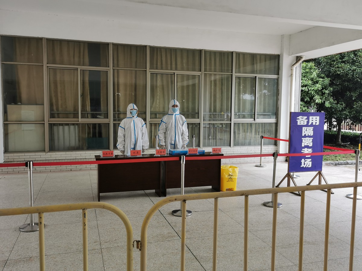 本次演练设置考生进入考点经体温检测发现异常和考试过程中监考人员发现或考生主动报告体温异常两个场景。为确保示范演练顺利进行,我校事先准备了多次排练,就各方面薄弱环节存在的问题收集教师意见,进一步优化流程、完善预案、增强配合、积累经验。