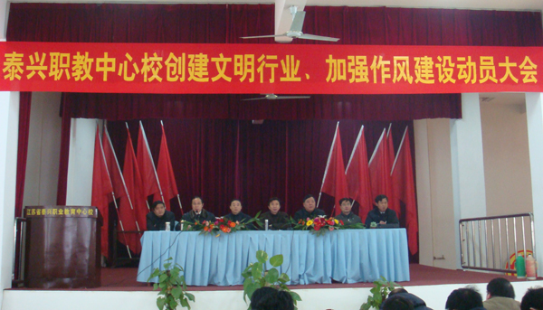 江苏省泰兴职业教育中心校召开开展“创建文明行为、加强作风建设”动员大会。2008年元月26日上午,泰兴职教中心校在图书馆一楼报告厅召开了全校教职工开展创建文明行业、加强作风建设活动的动员大会。虽然天气恶劣,大雪纷飞,但是全校教职工专心致志地聆听了朱留荣校长的报告。朱校长在报告中阐述了开展创建文明待业、加强作风建设活动的意义,总结了学校教职工在过去工作中取得的成绩,分析了学校教职工队伍中存在的问题,提出了这次开展文明行业、加强作风建设活动的目标。这次动员报告大会对全校教职工统一思想、更新观念、改进作风、提升形象,以文明创建的新成果和作风建设的新成效,促进队伍素质的大提高具有十分重要的指导意义。报告结束后,张日恒副校长对这次开展创建文明行业、加强作风建设活动作了精心部署。整个活动历时三个多月,共分五个阶段进行:学习教育阶段、对照排查阶段、集中整改阶段、长效管理阶段、总结阶段。对每一阶段都作出了具体要求。要求各处室教职工精心组织实施,着力解决教职工队伍中存在的作风问题,努力塑造作风优良、纪律严明、业务精通、业绩显著、人民满意的教师队伍。