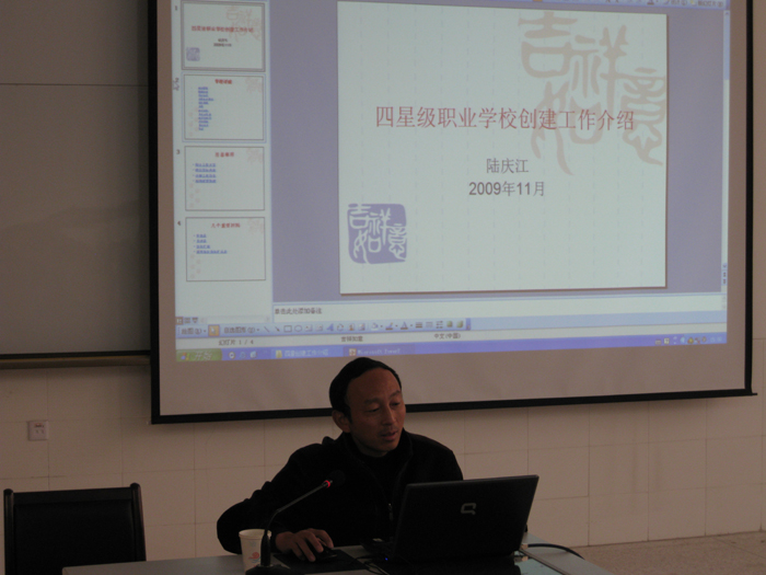 陆庆江副主任讲述了四星级职业学校评估工作的整个流程,评估过程中的注意点,这为我校创建江苏省四星级中等职业学校具有重要的指导意义。