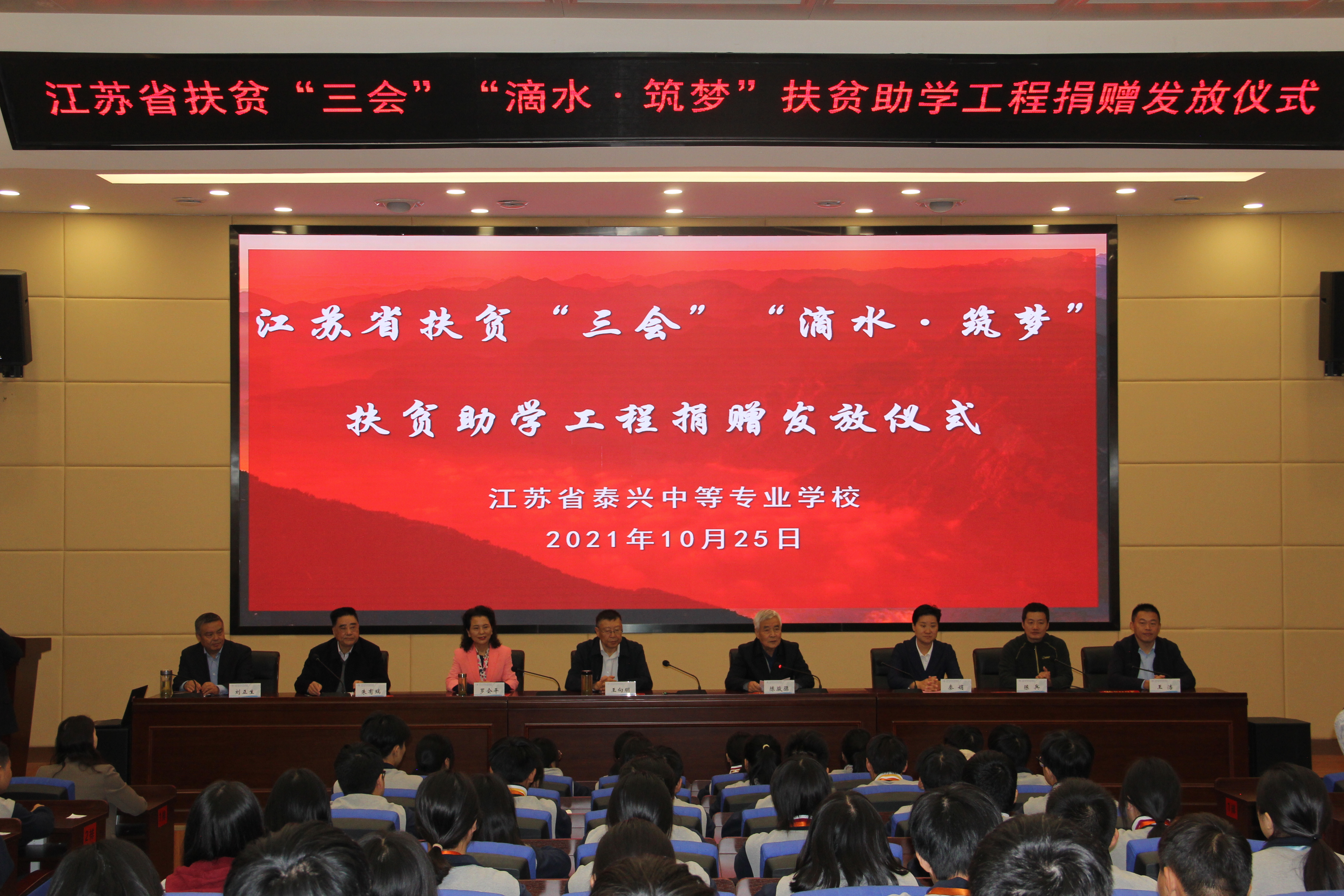 10月25日,省扶贫“三会”“滴水·筑梦”扶贫助学工程捐赠发放仪式在我校举行。省扶贫“三会”副理事长王向明、泰兴市副市长秦娟、省扶贫“三会”助学部部长罗会平、省扶贫“三会”办公室副主任陈兵、泰兴市扶贫“三会”会长朱有瑞、泰兴市教育局副局长王浩,我校副校长刘正生等出席捐赠仪式。省扶贫“三会”副理事长陈骏骠主持仪式。