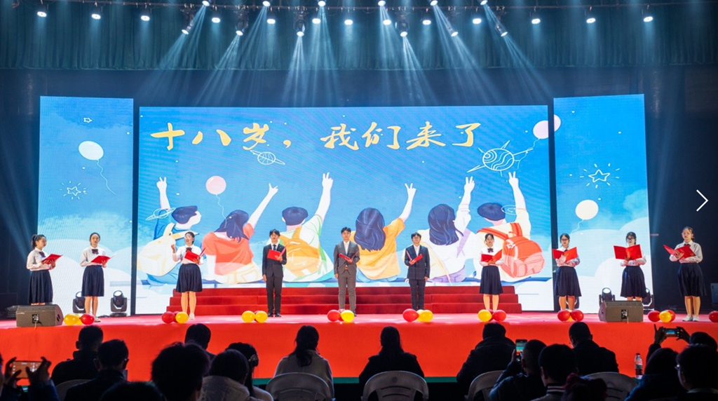 成人仪式分为《青春花路,共享成长》《真情感恩,铭记誓言》《责任在肩,梦想同行》三个篇章。合唱《望月》表达了同学们对父母、师长、朋友一路相伴的感激之情;诗朗诵《十八岁,我们来了》表达了同学们以梦为马、不负韶华的青春豪迈。悠扬的葫芦丝表演《映山红》、典雅的中国舞《不惜时光》和热力四射的街舞表演为整场仪式增添了多样的青春光彩。合唱《祝福祖国》表达了同学们深深的爱国情怀。