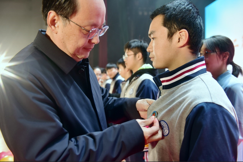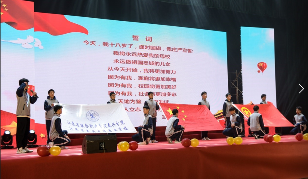 在活动中老师们通过视频方式为所有参加仪式的学生送上了祝福,为同学们送上了《中华人民共和国宪法》和成人纪念徽章。同学们面对国旗、团旗、校旗,以十八岁的名义庄严宣誓。
