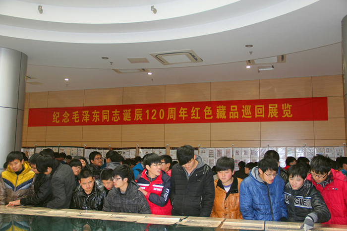 12月26日,由市邮政局和老干部集邮协会联合主办的“纪念毛泽东同志诞辰一百二十周年红色藏品巡回展览”在我校图文信息综合楼大厅隆重举行,吸引了全校数千名师生前来参观。
