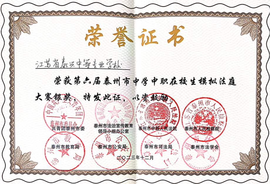 12月1日,第六届泰州市中学中职在校生模拟法庭大赛(决赛)在泰州市中级人民法院举行。本次比赛旨在模拟真实的法庭场景,让同学们通过扮演法官、律师等角色,亲身体验法庭的庄严和公正,提升自身的法律意识和法律素养。经过激烈角逐,我校代表队凭借出色的表现,荣获了本次比赛的第二名。扮演公诉人的黄亭煜同学被评为“优秀模拟公诉人”,扮演人民陪审员的张潞湉同学被评为“优秀诉讼参与人”。