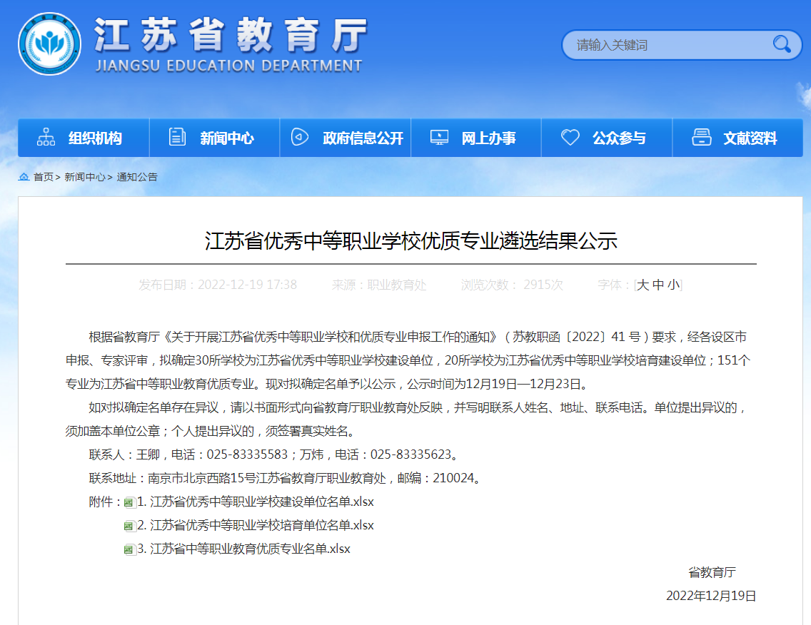 近日,省教育厅发布了《江苏省优秀中等职业学校优质专业遴选结果公示》,经各设区市申报、专家评审,拟确定151个专业为江苏省中等职业教育优质专业。我校机电技术应用和精细化工技术两个专业被认定为省优质专业。