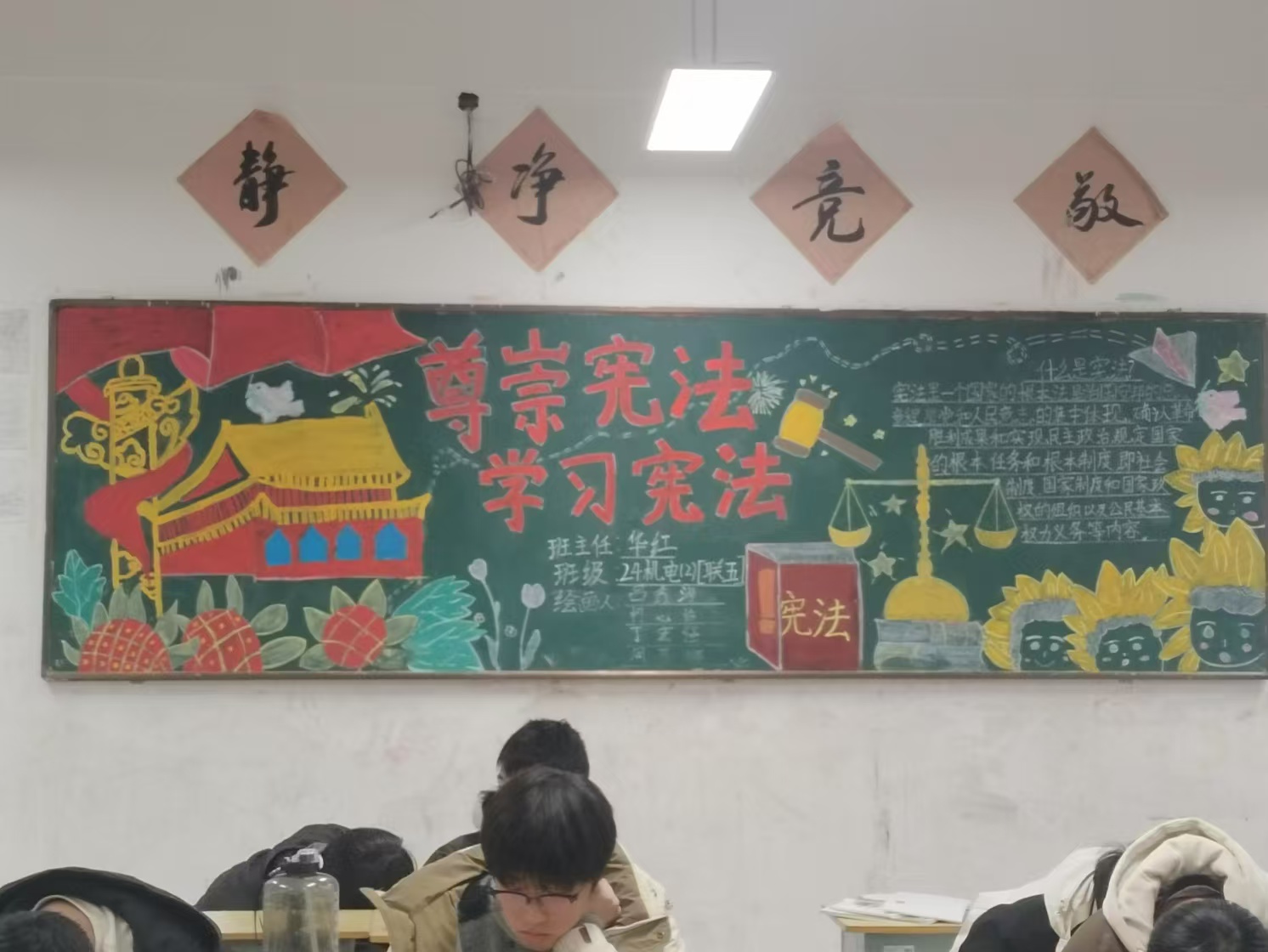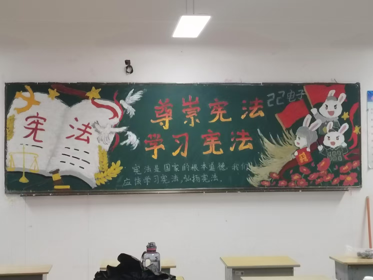 此外,学校还举办了一期以“尊崇宪法、学习宪法”为主题的黑板报比赛。各班级精心策划,用色彩斑斓的图画、工整有力的文字,生动展现了宪法知识、法治故事及学习体会,不仅美化了校园环境,更在全校范围内营造了浓厚的法制学习氛围。