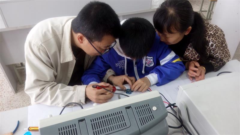 图为来自襟江小学的朱开轩小朋友在我校阚海辉老师的指导下,亲手焊接、组装一台小音箱。体验活动的开展,让中小学生可以走进自己感兴趣的行业,体验职业乐趣,启迪职业理想,进而体会劳动、尊敬劳动,培养实践动手能力。