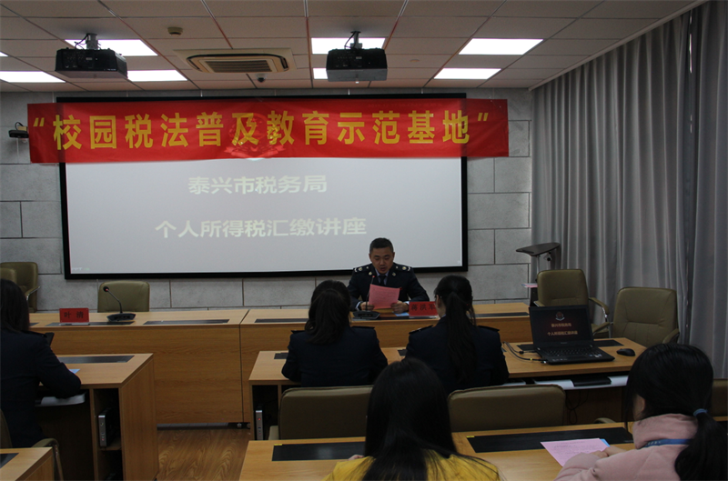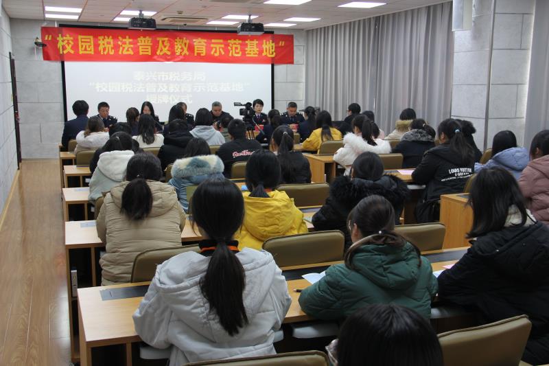 12月27日,我校举行“校园税法普及教育示范基地”授牌仪式并发放聘书。泰兴市税务局杨茗副局长、叶清、季爱民、钱湘芸、蒋洪军等税务专家应邀出席活动。学校刘正生副校长发表重要讲话。 在随后的个税汇缴座谈会上,税务干部蒋洪军同志用浅显易懂的语言和生活实例,向同学们介绍个人所得税的相关知识,让大家了解税收和诚信纳税的义务。 伍越、鞠亮两位同学表示今后将自觉学习宣传税收知识,当好税收宣传员,将税收知识带到每个家庭,使更多的人关心税收、支持税收。在自己将来的创业、就业中,认真履行纳税义务。 教师代表仇亚琴老师还结合学校办学特色、专业成长等,表示今后工作中将加强专业与税法的紧密度,在学校形成学税法、懂税法、护税法的浓厚氛围,并把税法教育作为学校法制教育的重要部分。