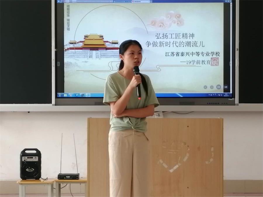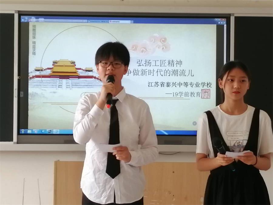 今天登场的班级是19学前教育(无锡)班,以“弘扬工匠精神,争做新时代的潮流儿”为主题,通过相声、分享讨论工匠精神、诗歌朗诵、舞蹈等形式,诠释了工匠精神的意义,让同学们深刻体会工匠精神的内涵。