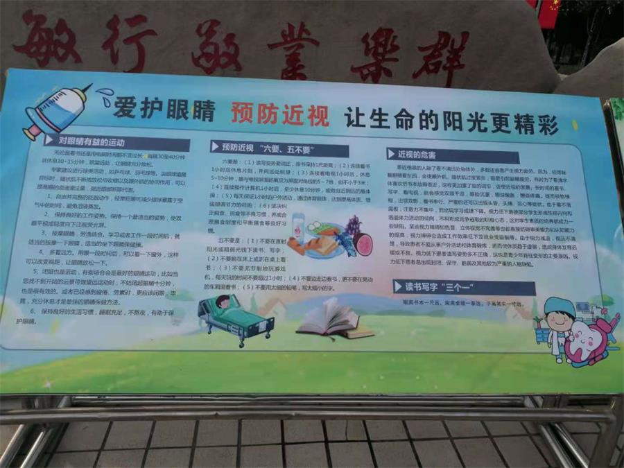 为落实市教育局等8部门《关于加强儿童青少年近视综合防控工作的实施办法》(泰教体艺〔2020〕2号),推进近视防控工作,进一步掀起近视防控宣传教育热潮,着力提高青少年视力健康水平,学校制定了《近视防控宣传教育月活动方案》,开展全校学生视力大检查,记录视力水平,建立学生视力档案。并通过电子屏幕、校园网、广播、宣传展板、家长微信群等渠道全方位开展宣传近视防控保健知识。