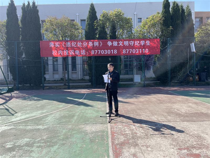 升旗仪式上,施文龙主任作了题为“落实《违纪处分条例》 争做文明守纪学生”的主题发言。他说,规章制度的建立和执行不是限制自由、约束个性,而是维护正常教育教学秩序,保障学生各项权益的基础。他希望同学们认真学习《学生违纪处分条例》,遵守条例规定,重拾敬畏之心,自觉管理好自己的一言一行、一举一动,争做有修养、守纪律、懂法律的新时代文明学生。