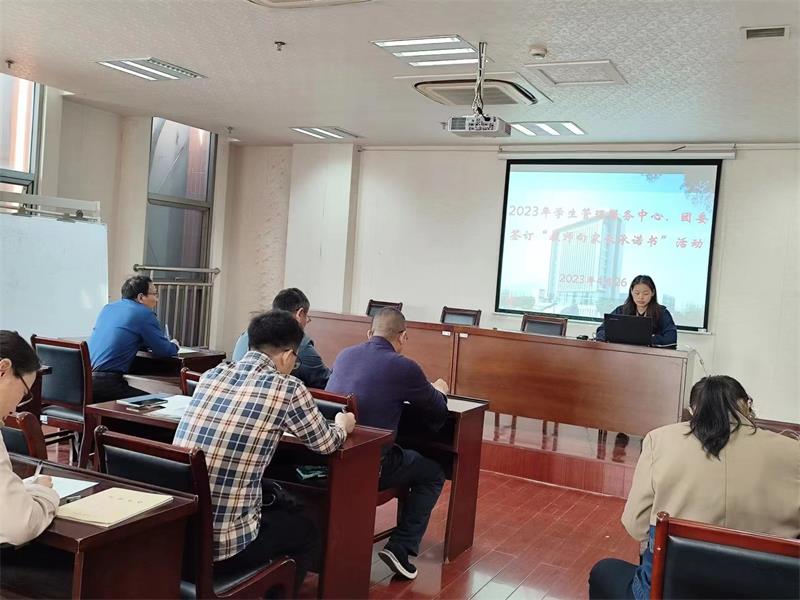 为进一步提高教师的职业道德水平,塑造良好的教育形象和师德风范,促进科室老师自觉履职尽责,4月27日学生管理服务中心、团委在5楼会议室组织全体教师认真学习教师向家长承诺的内容,并签订承诺书。