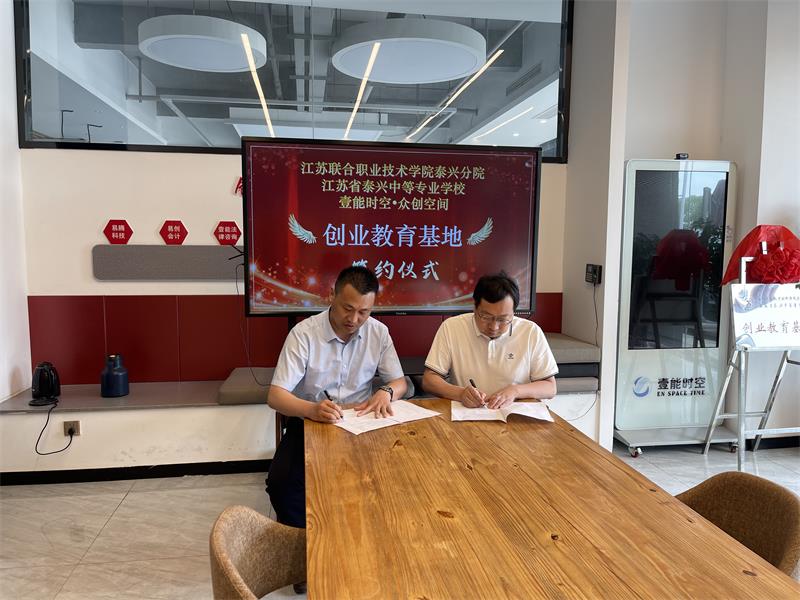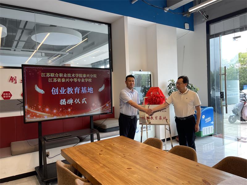 在2023年职教活动周之际,为落实泰州市教育局《关于举办2023年全市大中专院校创新创业大赛的通知》要求,进一步推进产教深度融合,加快创业教育基地建设,提高创新创业人才培养质量,5月16日,学校与壹能企划咨询江苏有限公司(壹能众创空间)签署了创业教育校企合作协议,并举行了“创业教育基地”揭牌仪式。“壹能众创空间” 总经理张正、学校副校长苏辉出席活动。