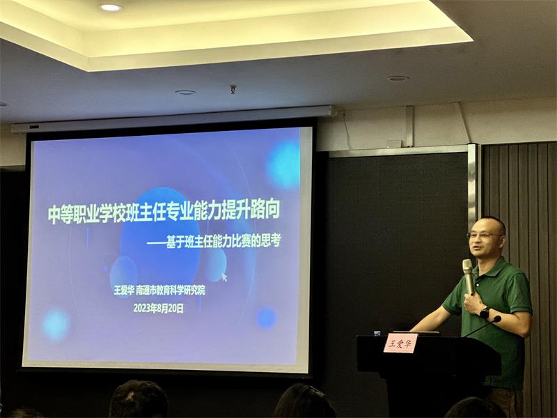 随后,南通市教育科学研究院职教教研员王爱华老师开展了《中等职业学校班主任专业能力提升路向——基于班主任能力比赛的思考》主题讲座。在讲座中,王老师从三个方面展开论述:一是中职班主任工作的自我审视;二是新时代中职班主任工作的价值与要求;三是基于比赛视角的中职班主任能力提升路向。