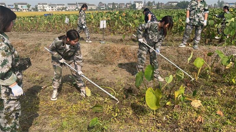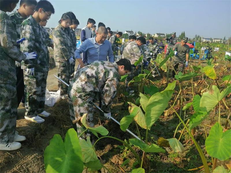 在芋头采摘地,基地教官给同学们详细讲解了采摘芋头的注意事项,亲自示范了如何使用锄头挖芋头。“芋头不能用手拔,一定要用锄头慢慢耙”,在教官的耐心讲解后,同学们逐渐熟练了农耕的技术要领,炎炎烈日也阻挡不了同学们的热情。很多学生都说这是第一次到田地里挖芋头,他们挖出来的不仅是满满几筐芋头,更是收获了劳动带来的喜悦。