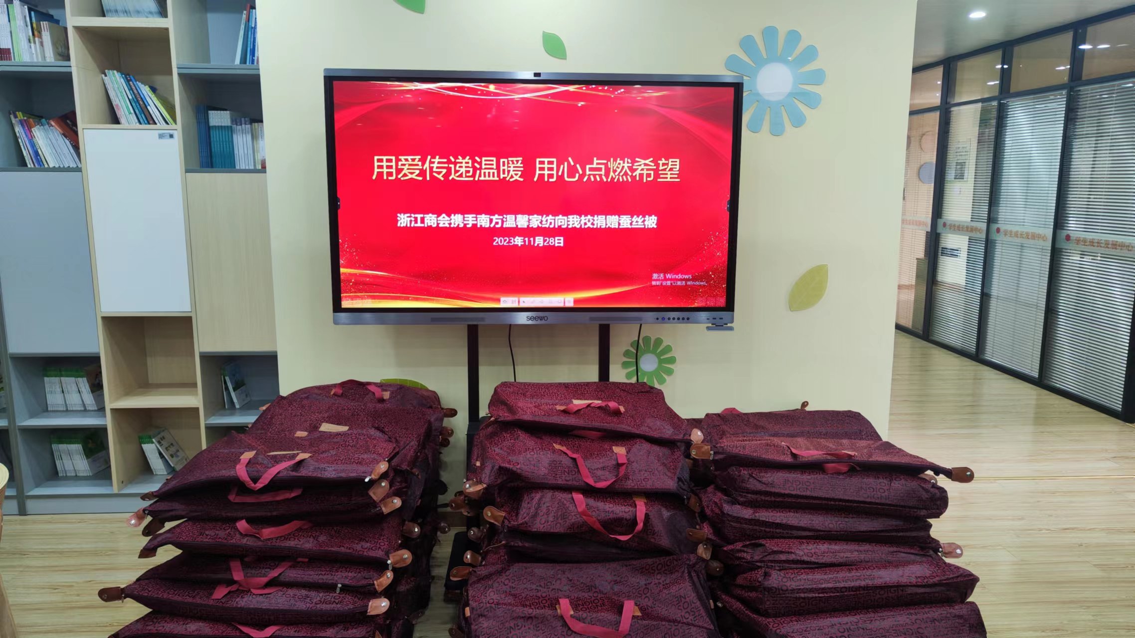 为响应政府号召,履行企业社会责任,弘扬传统美德,倡导助学风尚,用爱传递温暖,用心点燃希望。浙江商会携手南方温馨家纺,开展情暖校园爱心传递活动,向我校捐赠104床蚕丝被。