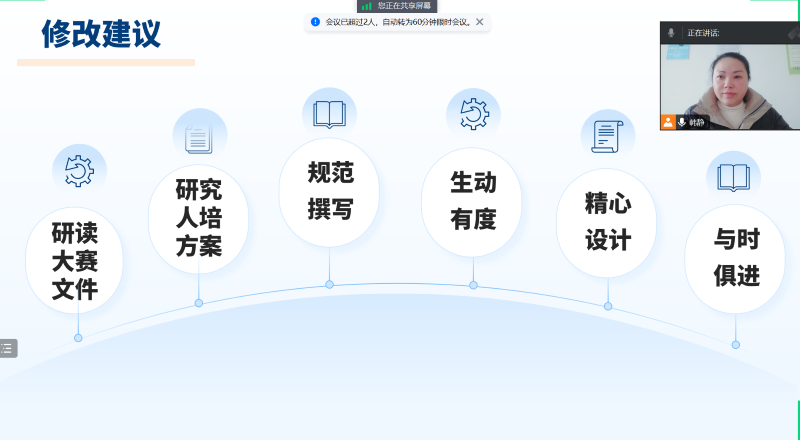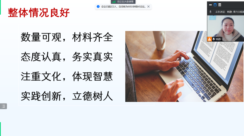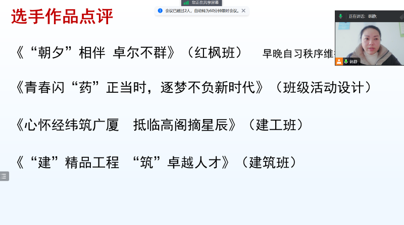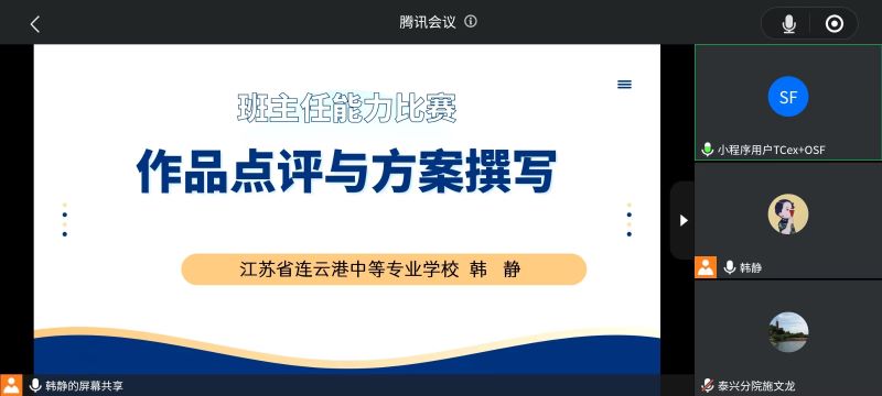 韩静老师线上对在泰兴市职业学校班主任能力比赛优秀选手的作品从班级建设方案、管理育人案例等方面逐一进行了点评,提出存在的问题,给予很多中肯的意见。与会老师纷纷表示韩老师的点评精准把脉、一针见血,达到以赛促建的活动目标,收到良好效果。